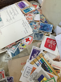 I took a stop at the Penny Ranch in Chico,CA on my way to my parents house. I wanted to pick up some stamps and old letters from the owner John. The collectible store filled with stamps, baseball cards, and comic and coins has been there for as long as I can remember when I was growing up in Chico. The funny thing is I never shopped there until recently after I got more involved in mail art and teaching creative re-use workshops.  Here is a quick look at some of this weekend finds.. I don't buy anything collectible in the traditional stamp collecting sense since I will be repurposing them.